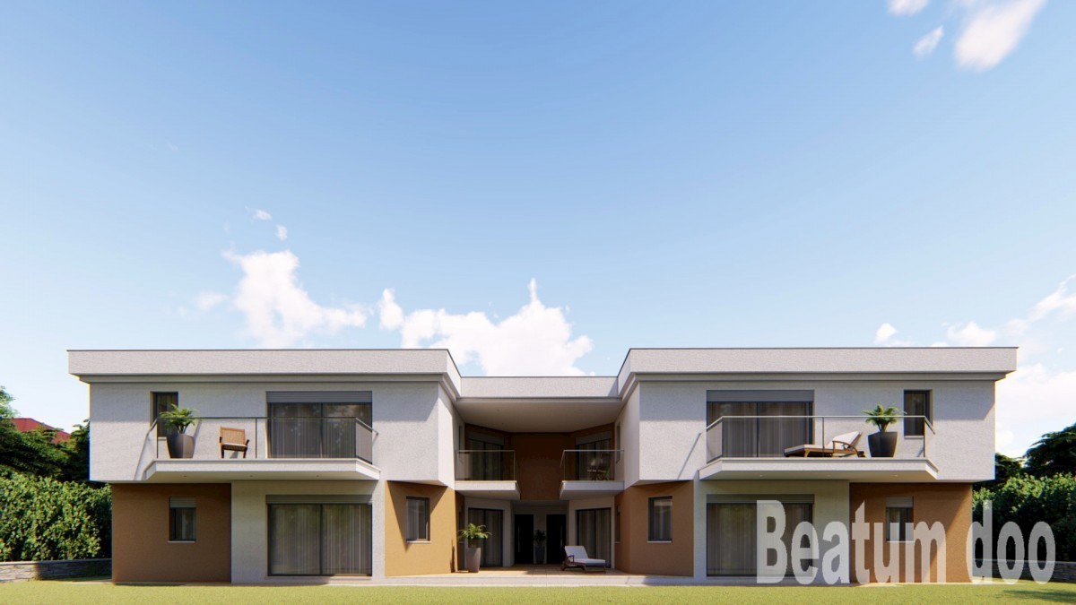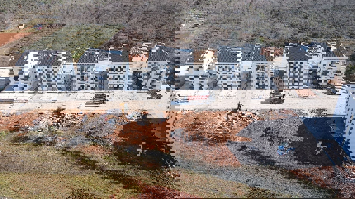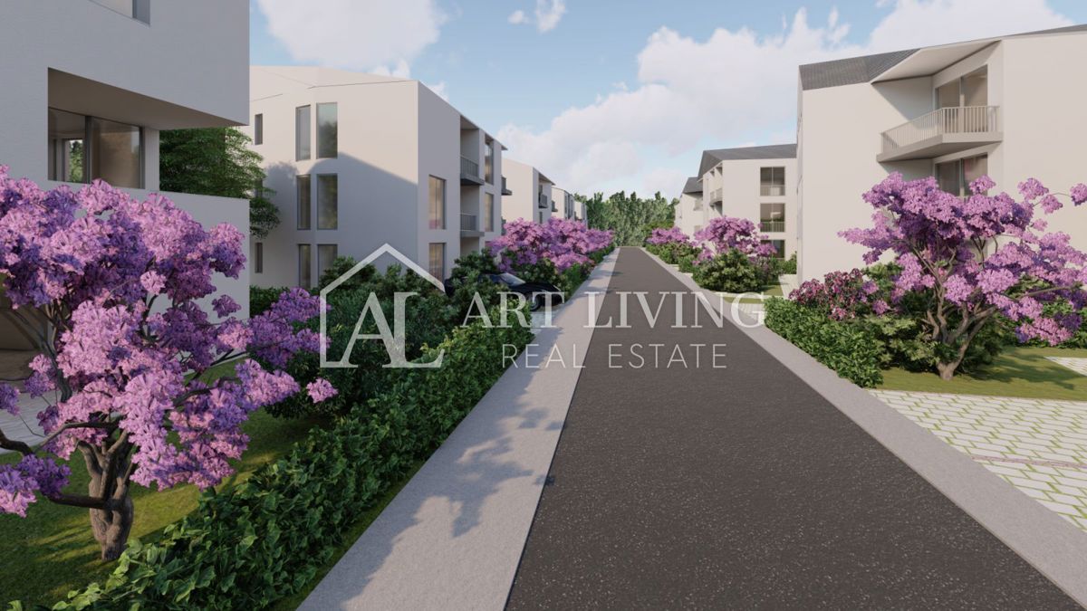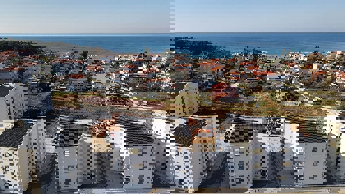 Novogradnja , dvosobni stan sa pogledom na more , garaža, ostava , balkon, terasa, prostor za bicikl , 300 m od plaže , klima , podno grijanje , prizemni stanovi imaju vrt , kvalitetni materijali , završetak 06.2023 .