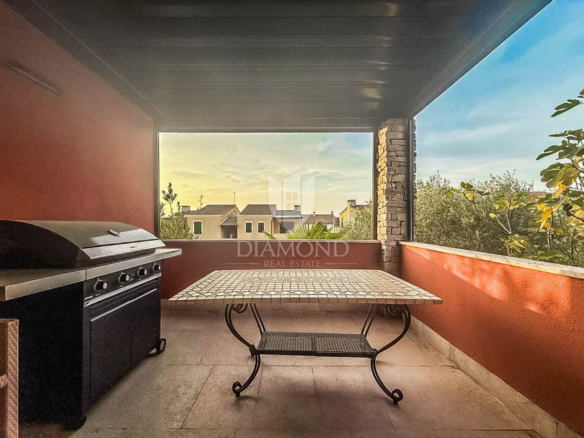 Umag, Istra U okolici Umaga u mirnom naselju okruženom zelenilom, na samo 400 m od plaže nalazi se ovaj lijepi i prostran stan sa dvije spavaće sobe od 69,79 m2. Stan se nalazi u manjoj zgradi na 1. katu. Sastoji se od ulaznog hod