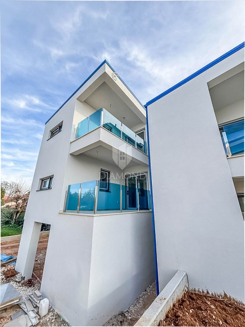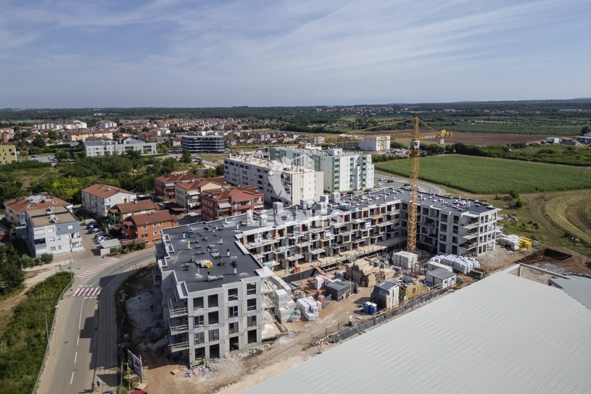Umag, centar, stambena zgrada u izgradnji, ukupno 122 stana, 3 stubišta, 3 lifta, podzemna garaža i ostave, a stanovi su smješteni u prizemlju, prvom, drugom i trećem katu. Stanovi u prizemlju imaju vrt, a stanovi na trećem katu imaju