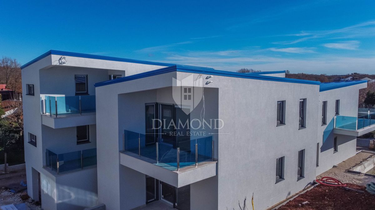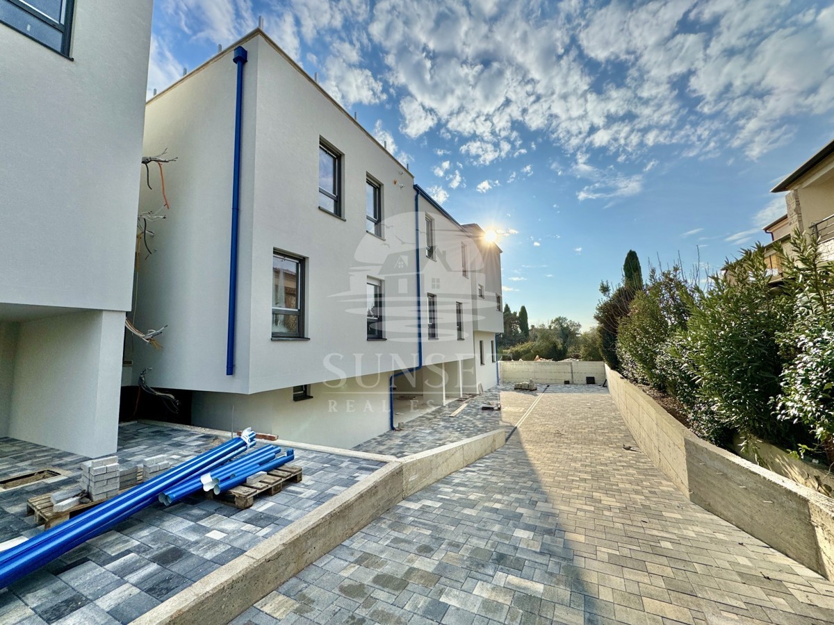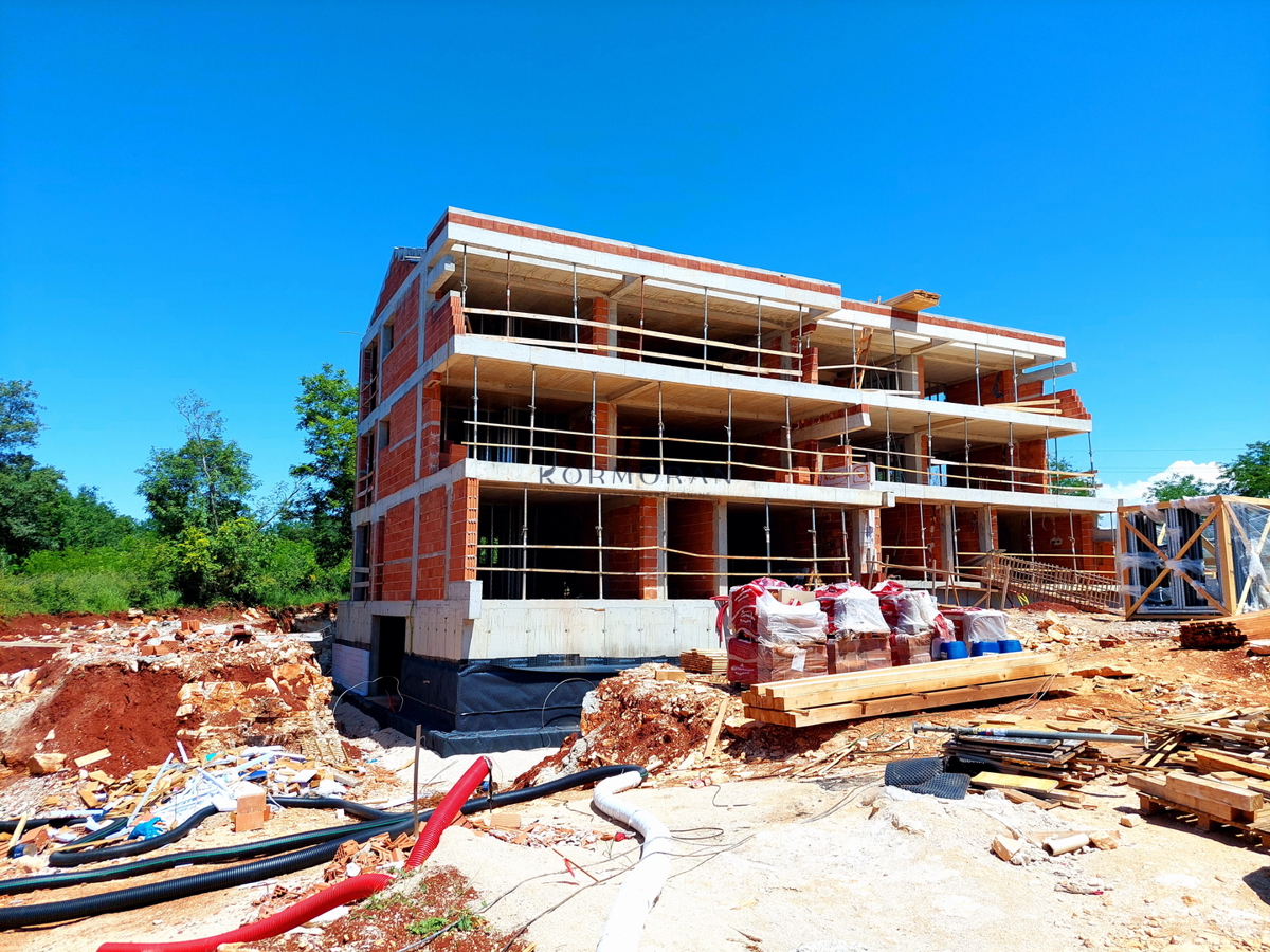 Umag, centar, stambena zgrada u izgradnji, ukupno 122 stana, 3 stubišta, 3 lifta, podzemna garaža i ostave, a stanovi su smješteni u prizemlju, prvom, drugom i trećem katu. Stanovi u prizemlju imaju vrt, a stanovi na trećem katu imaju