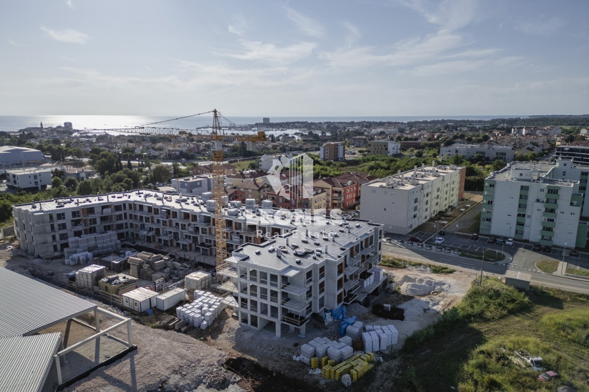 Umag, centar, stambena zgrada u izgradnji, ukupno 122 stana, 3 stubišta, 3 lifta, podzemna garaža i ostave, a stanovi su smješteni u prizemlju, prvom, drugom i trećem katu. Stanovi u prizemlju imaju vrt, a stanovi na trećem katu imaju