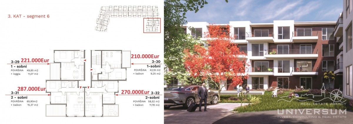 Moderna i visokokvalitetna zgrada u izgradnji u Umagu. Opis zgrade: Sastoji od četiri ulaza te ukupno 122 stana – različitih rasporeda i kvadratura. Projekt nudi lepezu od studia, jednosobnih (+ dnevni boravak), dvosobnih (+ dnevni b