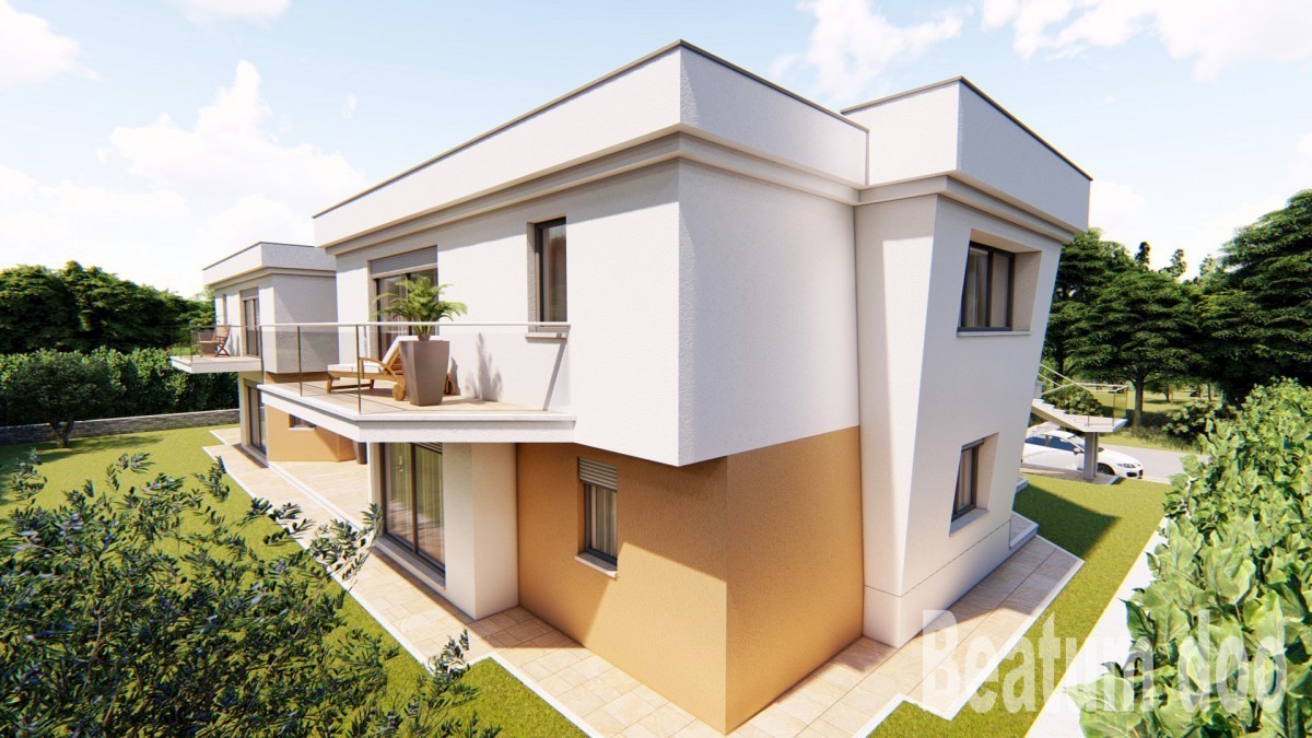 Novogradnja , dvosobni stan sa pogledom na more , garaža, ostava , balkon, terasa, prostor za bicikl , 300 m od plaže , klima , podno grijanje , prizemni stanovi imaju vrt , kvalitetni materijali , završetak 06.2023 .