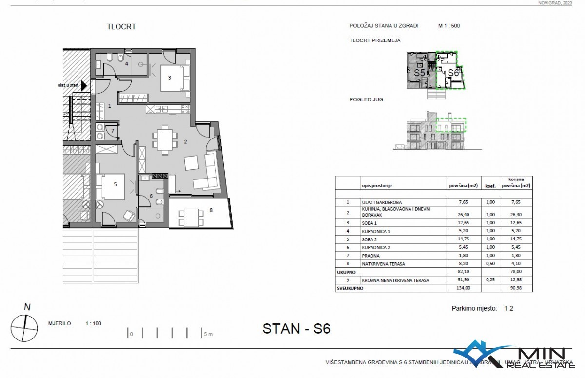 Na prodaju je novoizgrađen stan u Zambratiji izgrađen od visokokvalitetnih materijala te obložen keramičkim pločicama visoke kvalitete. Stan je smješten u zgradi od ukupno 6 stanova te se nalazi na 2. katu. Stan ima 78, 05 m2 i sastoji se od hodnika, kupa